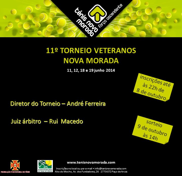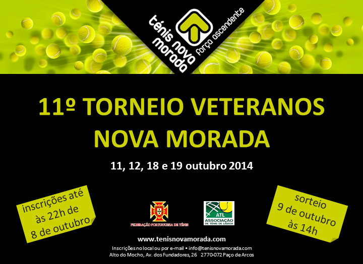Nos fins de semana de 11/12 e 18/19 de Outubro de 2014 irá ser realizado o 11º Torneio Veteranos Nova Morada que se realizará no Centro de Ténis Nova Morada.